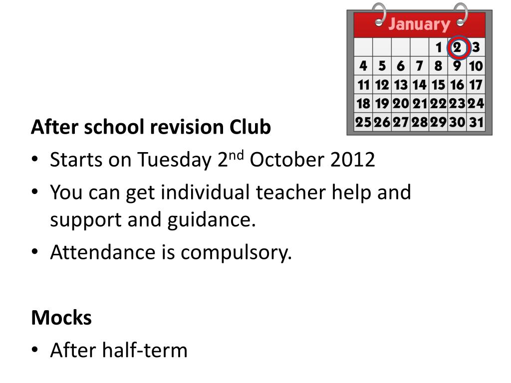After school revision Club • Starts on Tuesday 2nd October 2012 • You can get individual teacher help and support and guidance. • Attendance is compulsory. Mocks • After half-term