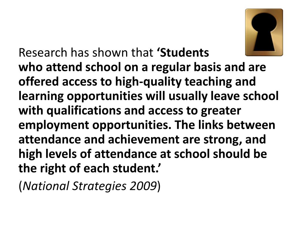 Research has shown that ‘Students who attend school on a regular basis and are offered access to high-quality teaching and learning opportunities will usually leave school with qualifications and access to greater employment opportunities. The links between attendance and achievement are strong, and high levels of attendance at school should be the right of each student.’ (National Strategies 2009)