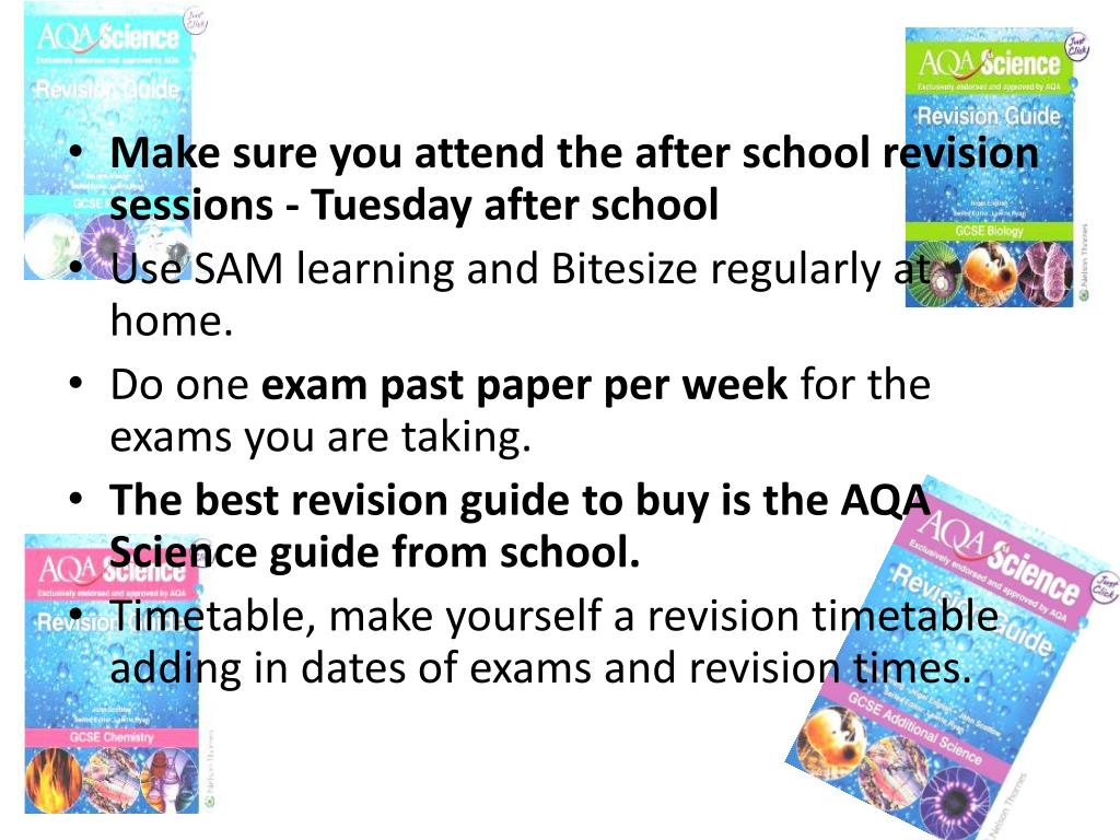 Make sure you attend the after school revision sessions - Tuesday after school • Use SAM learning and Bitesize regularly at home. • Do one exam past paper per week for the exams you are taking. • The best revision guide to buy is the AQA Science guide from school. • Timetable, make yourself a revision timetable adding in dates of exams and revision times.
