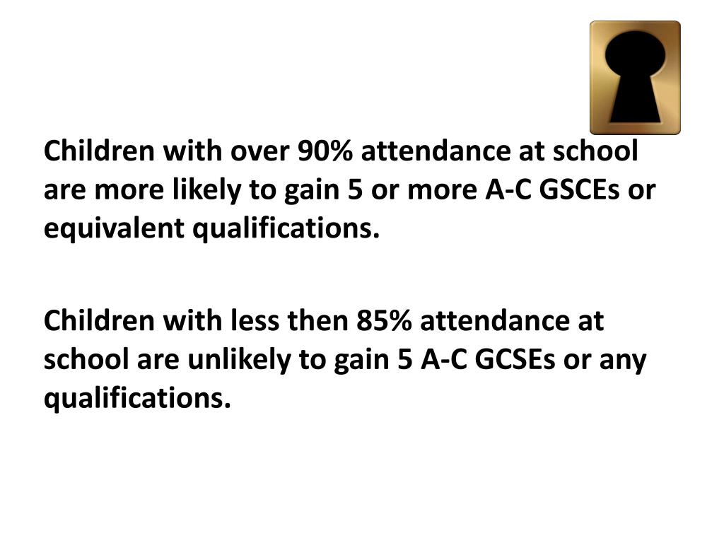 Children with over 90% attendance at school are more likely to gain 5 or more A-C GSCEs or equivalent qualifications. Children with less then 85% attendance at school are unlikely to gain 5 A-C GCSEs or any qualifications.