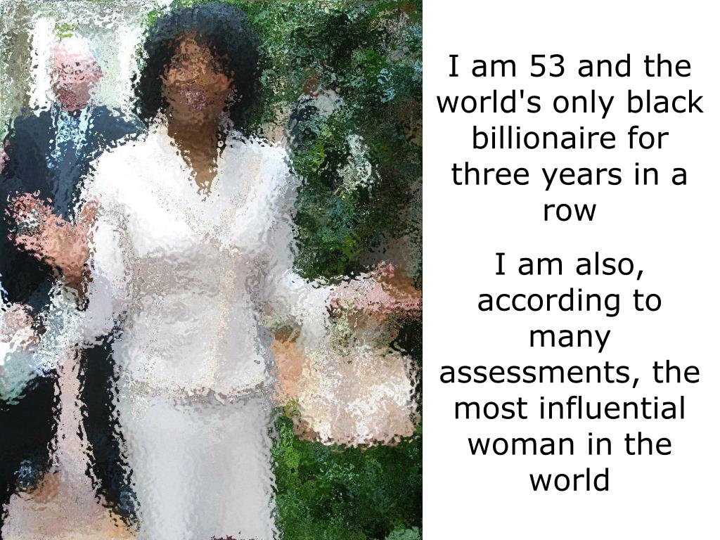 I am 53 and the world's only black billionaire for three years in a row I am also, according to many assessments, the most influential woman in the world