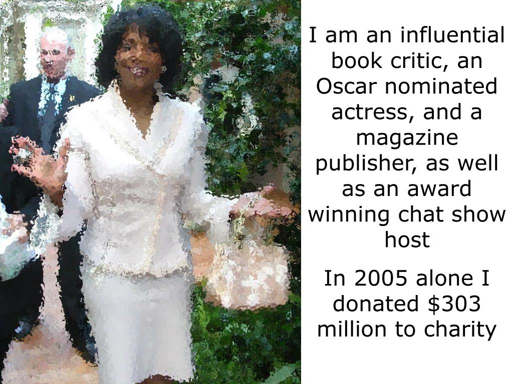 I am an influential book critic, an Oscar nominated actress, and a magazine publisher, as well as an award winning chat show host In 2005 alone I donated $303 million to charity