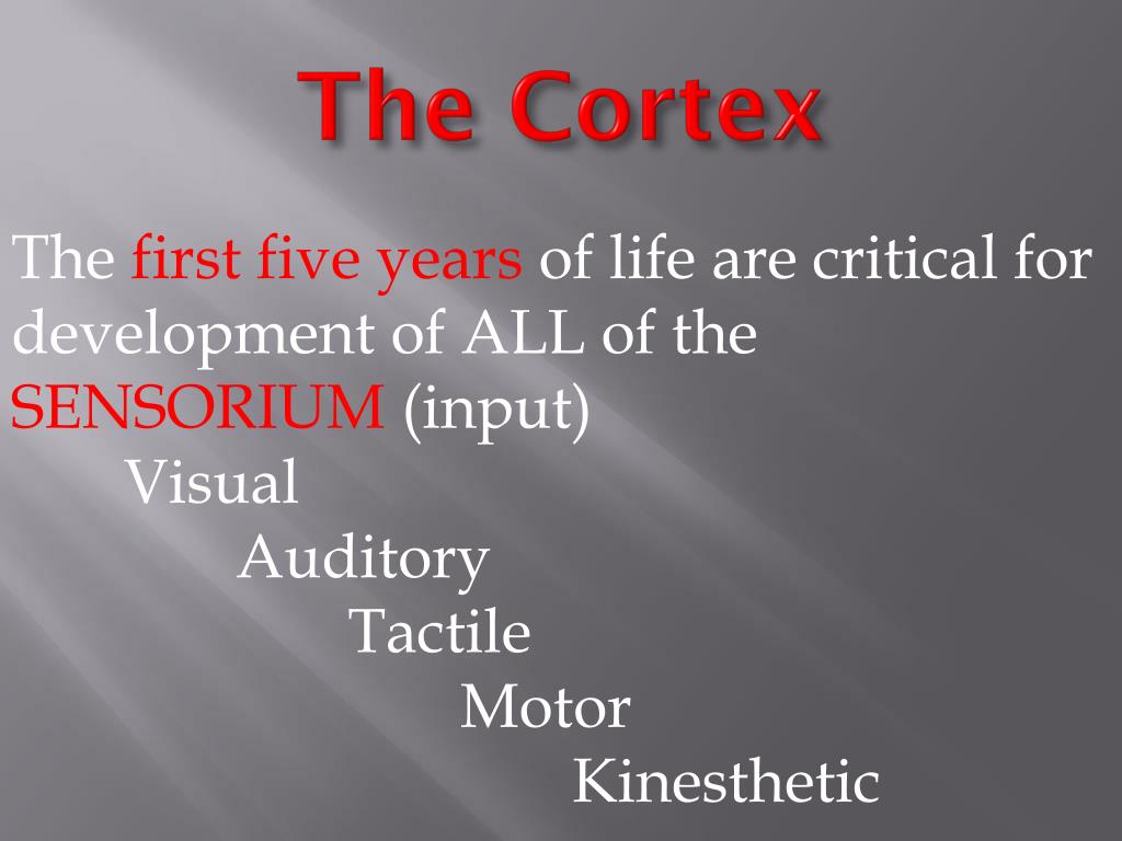 The Cortex The first five years of life are critical for development of ALL of the SENSORIUM (input) Visual Auditory Tactile Motor Kinesthetic