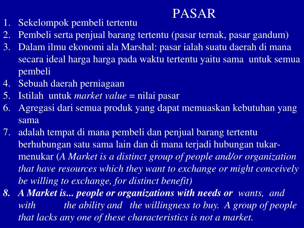 Sekelompok pembeli tertentu • Pembeli serta penjual barang tertentu (pasar ternak, pasar gandum) • Dalam ilmu ekonomi ala Marshal: pasar ialah suatu daerah di mana secara ideal harga harga pada waktu tertentu yaitu sama untuk semua pembeli • Sebuah daerah perniagaan • Istilah untuk market value = nilai pasar • Agregasi dari semua produk yang dapat memuaskan kebutuhan yang sama • adalah tempat di mana pembeli dan penjual barang tertentu berhubungan satu sama lain dan di mana terjadi hubungan tukar-menukar (A Market is a distinct group of people and/or organization that have resources which they want to exchange or might conceively be willing to exchange, for distinct benefit) • A Market is... people or organizations with needs or wants, and with the ability and the willingness to buy. A group of people that lacks any one of these characteristics is not a market. PASAR