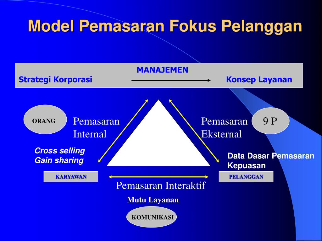 Model Pemasaran Fokus Pelanggan MANAJEMEN Strategi Korporasi Konsep Layanan Pemasaran Internal Pemasaran Eksternal 9 P ORANG Cross selling Gain sharing Data Dasar Pemasaran Kepuasan KARYAWAN PELANGGAN Pemasaran Interaktif Mutu Layanan KOMUNIKASI