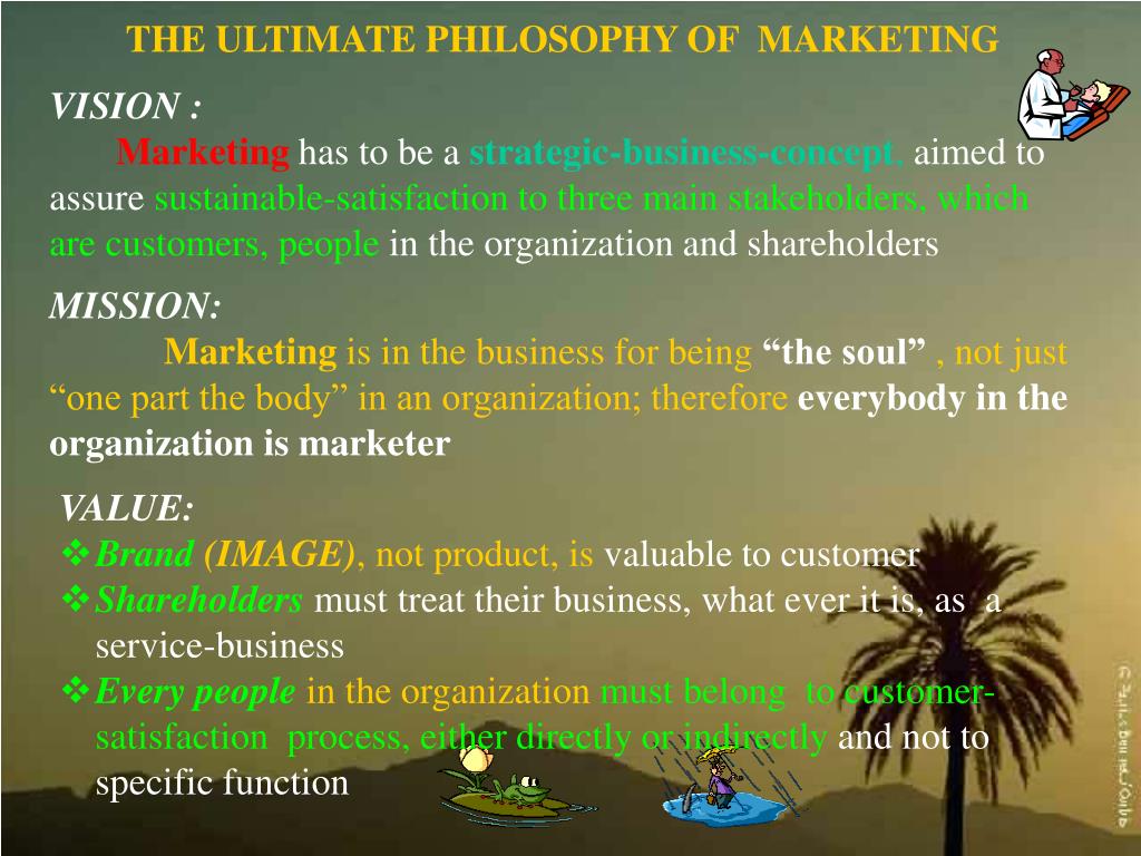 THE ULTIMATE PHILOSOPHY OF MARKETING VISION : Marketinghas to be a strategic-business-concept, aimed to assure sustainable-satisfaction to three main stakeholders, which are customers, people in the organization and shareholders MISSION:Marketing is in the business for being “the soul” , not just “one part the body” in an organization; therefore everybody in the organization is marketer VALUE: • Brand (IMAGE), not product, is valuable to customer • Shareholdersmust treat their business, what ever it is, as a service-business • Every people in the organization must belong to customer-satisfaction process, either directly or indirectlyand not to specific function