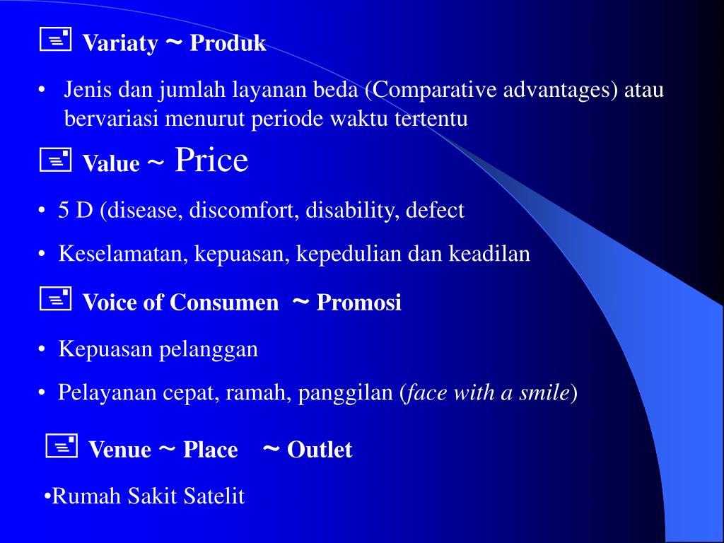 Variaty ~ Produk • Jenis dan jumlah layanan beda (Comparative advantages) atau bervariasi menurut periode waktu tertentu • Value~ Price • 5 D (disease, discomfort, disability, defect • Keselamatan, kepuasan, kepedulian dan keadilan • Voice of Consumen ~ Promosi • Kepuasan pelanggan • Pelayanan cepat, ramah, panggilan (face with a smile) • Venue ~ Place ~ Outlet • Rumah Sakit Satelit