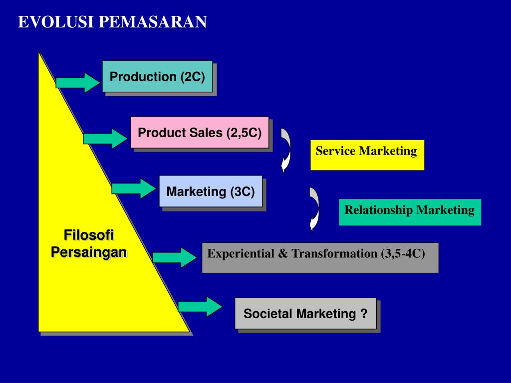 Production (2C) Product Sales (2,5C) Service Marketing Marketing (3C) Relationship Marketing Experiential & Transformation (3,5-4C) Societal Marketing ? EVOLUSI PEMASARAN Filosofi Persaingan