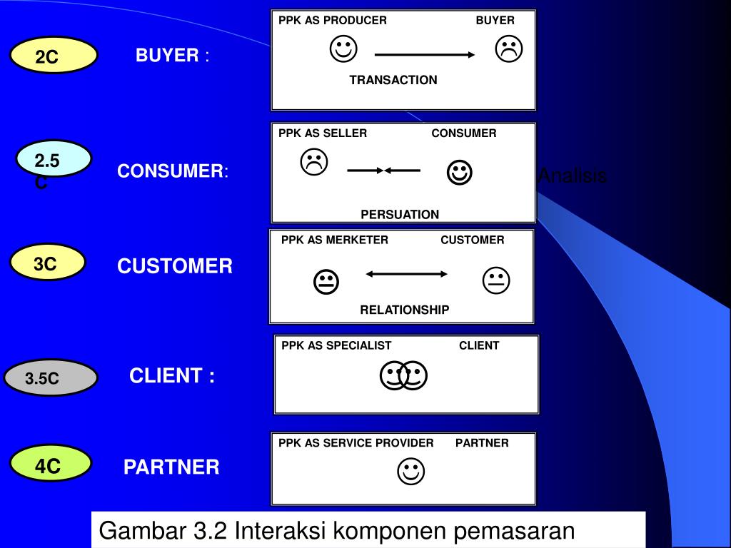 PPK AS PRODUCER BUYER TRANSACTION 2C BUYER : PPK AS SELLER CONSUMER PERSUATION CONSUMER: 2.5C Analisis PPK AS MERKETER CUSTOMER RELATIONSHIP 3C CUSTOMER CLIENT : PPK AS SPECIALIST CLIENT 3.5C PPK AS SERVICE PROVIDER PARTNER 4C PARTNER Gambar 3.2 Interaksi komponen pemasaran