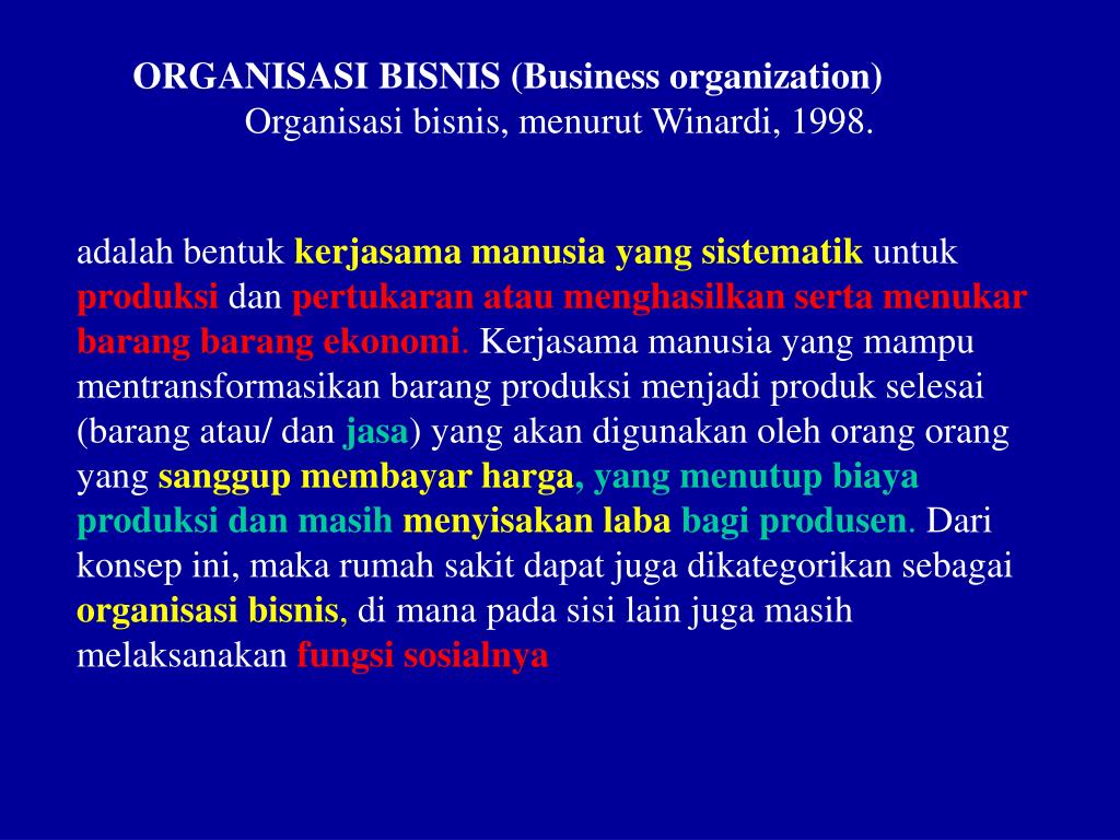 ORGANISASI BISNIS (Business organization) Organisasi bisnis, menurut Winardi, 1998. adalah bentuk kerjasama manusia yang sistematikuntuk produksi dan pertukaran atau menghasilkan serta menukar barang barang ekonomi. Kerjasama manusia yang mampu mentransformasikan barang produksi menjadi produk selesai (barang atau/ dan jasa) yang akan digunakan oleh orang orang yang sanggup membayar harga, yang menutup biaya produksi dan masih menyisakan laba bagi produsen. Dari konsep ini, maka rumah sakit dapat juga dikategorikan sebagai organisasi bisnis, di mana pada sisi lain juga masih melaksanakan fungsi sosialnya