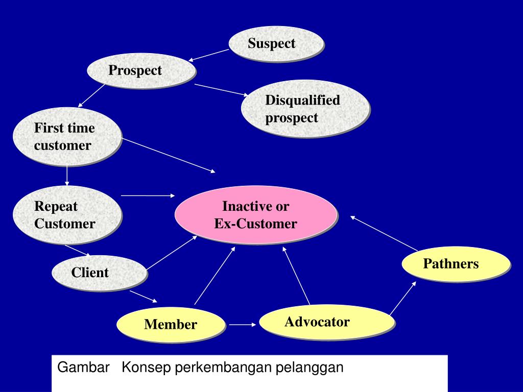 Suspect Prospect Disqualified prospect First time customer Repeat Customer Inactive or Ex-Customer Pathners Client Gambar Konsep perkembangan pelanggan Advocator Member