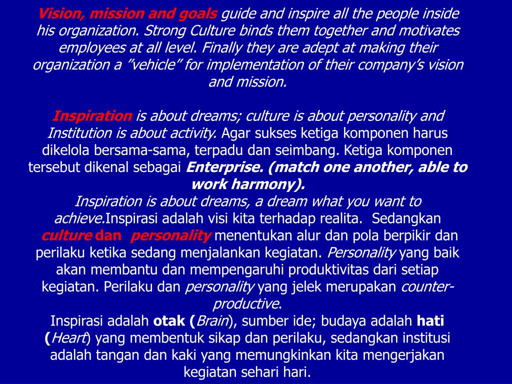 Vision, mission and goals guide and inspire all the people inside his organization. Strong Culture binds them together and motivates employees at all level. Finally they are adept at making their organization a ”vehicle” for implementation of their company’s vision and mission. Inspirationis about dreams; culture is about personality and Institution is about activity. Agar sukses ketiga komponen harus dikelola bersama-sama, terpadu dan seimbang. Ketiga komponen tersebut dikenal sebagai Enterprise. (match one another, able to work harmony). Inspiration is about dreams, a dream what you want to achieve.Inspirasi adalah visi kita terhadap realita.Sedangkan culture dan personalitymenentukan alur dan pola berpikir dan perilaku ketika sedang menjalankan kegiatan. Personality yang baik akan membantu dan mempengaruhi produktivitas dari setiap kegiatan. Perilakudan personality yang jelek merupakan counter-productive. Inspirasi adalah otak (Brain), sumber ide; budaya adalah hati (Heart) yang membentuk sikap dan perilaku, sedangkan institusi adalah tangan dan kaki yang memungkinkan kita mengerjakan kegiatan sehari hari.