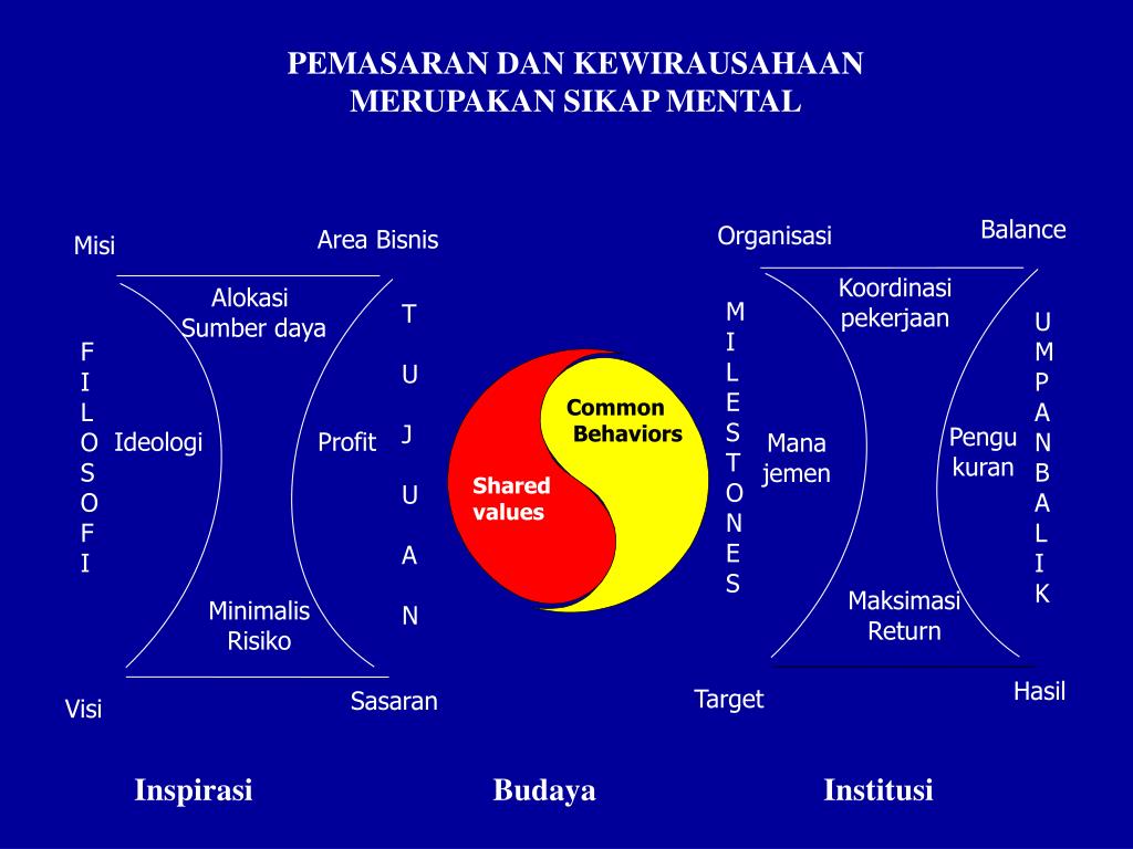 Area Bisnis Balance Misi Organisasi Alokasi Sumber daya Koordinasi pekerjaan T U J U A N F I L OSOFI MILESTONES UMPAN BALIK Common Behaviors Pengu kuran Ideologi Profit Mana jemen Shared values Minimalis Risiko Maksimasi Return Sasaran Hasil Visi Target PEMASARAN DAN KEWIRAUSAHAAN MERUPAKAN SIKAP MENTAL Inspirasi Budaya Institusi