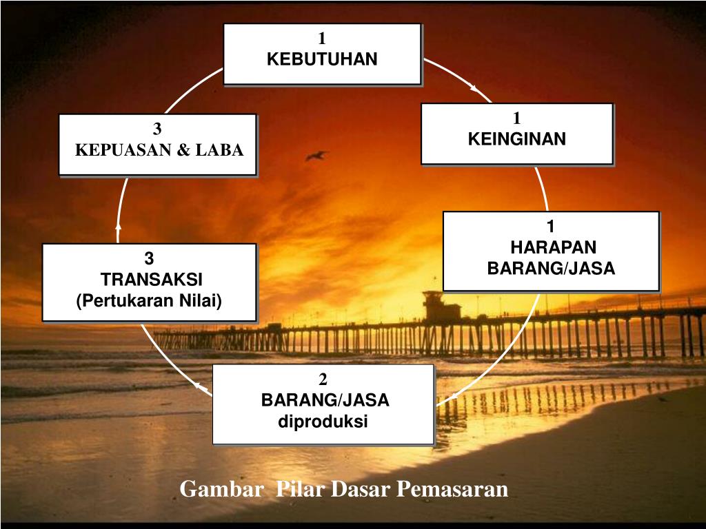 1 KEBUTUHAN 1 KEINGINAN 3 KEPUASAN & LABA 1 HARAPAN BARANG/JASA 3 TRANSAKSI (Pertukaran Nilai) 2 BARANG/JASA diproduksi Gambar Pilar Dasar Pemasaran