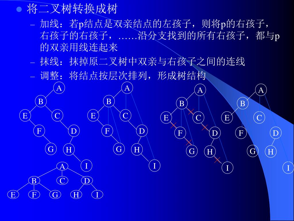 将二叉树转换成树 • 加线:若p结点是双亲结点的左孩子,则将p的右孩子,右孩子的右孩子,……沿分支找到的所有右孩子,都与p的双亲用线连起来 • 抹线:抹掉原二叉树中双亲与右孩子之间的连线 • 调整:将结点按层次排列,形成树结构 A A A B B A B E C E C E C B C D F D F D A F D E F G H I G H B G H G H E C I I I F D G H I
