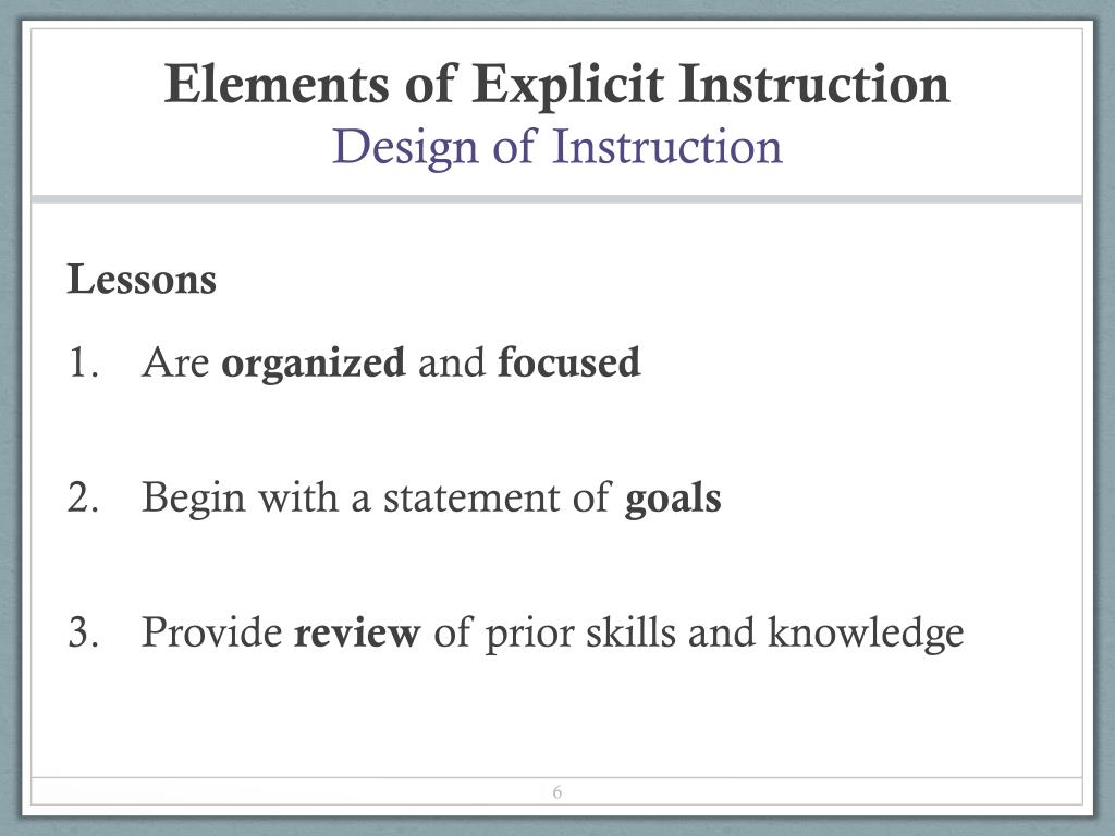 Elements of Explicit InstructionDesign of Instruction Lessons 1. Are organized and focused 2. Begin with a statement of goals 3. Provide review of prior skills and knowledge
