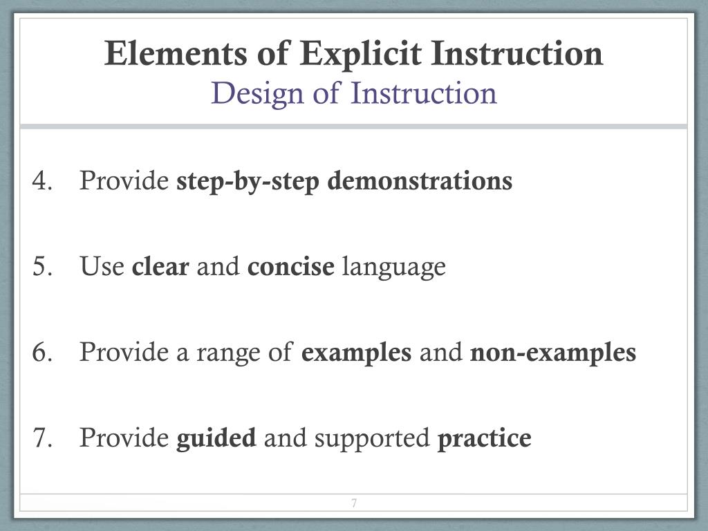 Elements of Explicit InstructionDesign of Instruction 4. Provide step-by-step demonstrations 5. Use clear and concise language 6. Provide a range of examples and non-examples 7. Provide guided and supported practice