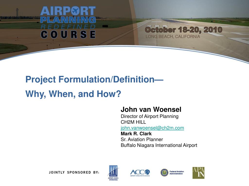 October 18-20, 2010 LONG BEACH, CALIFORNIA Project Formulation/Definition— Why, When, and How? John van Woensel Director of Airport Planning CH2M HILL john.vanwoensel@ch2m.com Mark R. Clark Sr. Aviation Planner Buffalo Niagara International Airport