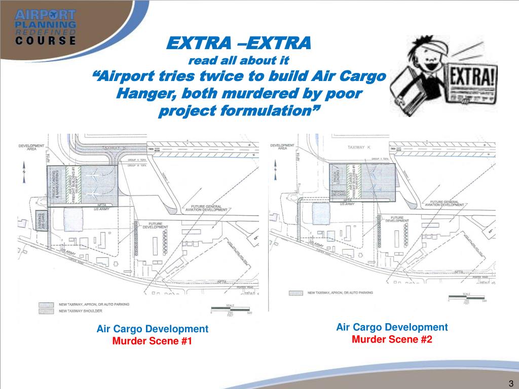 EXTRA –EXTRA read all about it “Airport tries twice to build Air Cargo Hanger, both murdered by poor project formulation” Air Cargo Development Murder Scene #2 Air Cargo Development Murder Scene #1