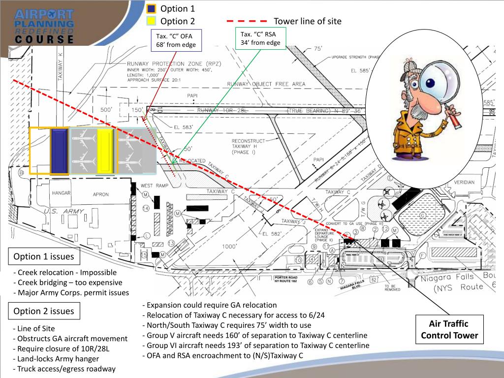 Option 1 Option 2 Tower line of site Tax. “C” RSA 34’ from edge Tax. “C” OFA 68’ from edge Option 1 issues • - Creek relocation - Impossible • Creek bridging – too expensive • Major Army Corps. permit issues • - Expansion could require GA relocation • Relocation of Taxiway C necessary for access to 6/24 • North/South Taxiway C requires 75’ width to use • Group V aircraft needs 160’ of separation to Taxiway C centerline • Group VI aircraft needs 193’ of separation to Taxiway C centerline • OFA and RSA encroachment to (N/S)Taxiway C Option 2 issues Air Traffic Control Tower • - Line of Site • Obstructs GA aircraft movement • Require closure of 10R/28L • Land-locks Army hanger • Truck access/egress roadway