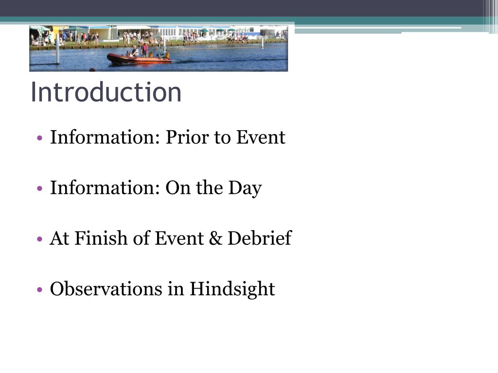 Introduction • Information: Prior to Event • Information: On the Day • At Finish of Event & Debrief • Observations in Hindsight