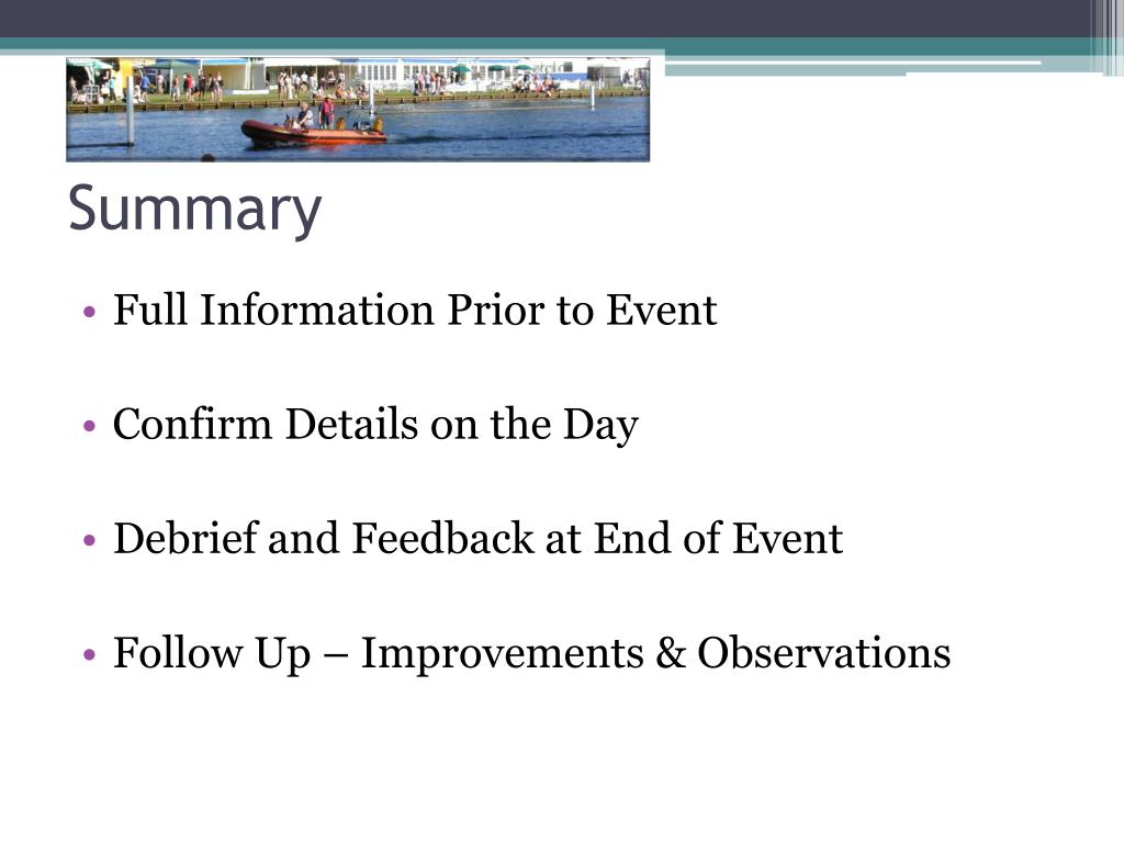 Post Event: Observations in Hindsight • Organiser to feedback any relevant comments to Safety Boat • Safety Boat to feedback any relevant comments to Organiser • Follow Up Written Incident Reports • Improvement Suggestions for Future Events