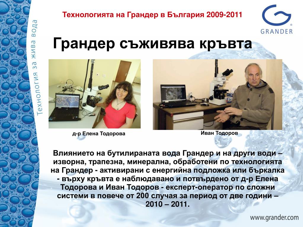 Технологията на Грандер в България 2009-2011 Грандер съживява кръвта д-р Елена Тодорова Иван Тодоров Влиянието на бутилираната вода Грандер и на други води – изворна, трапезна, минерална, обработени по технологията на Грандер - активирани с енергийна подложка или бъркалка - върху кръвта е наблюдавано и потвърдено от д-р Елена Тодорова и Иван Тодоров - експерт-оператор по сложни системи в повече от 200 случая за период от две години – 2010 – 2011.
