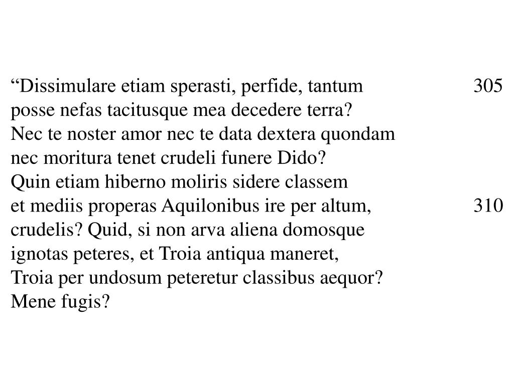 “Dissimulare etiam sperasti, perfide, tantum 305posse nefas tacitusque mea decedere terra? Nec te noster amor nec te data dextera quondam nec moritura tenet crudeli funere Dido? Quin etiam hiberno moliris sidere classem et mediis properas Aquilonibus ire per altum, 310crudelis? Quid, si non arva aliena domosque ignotas peteres, et Troia antiqua maneret, Troia per undosum peteretur classibus aequor? Mene fugis?
