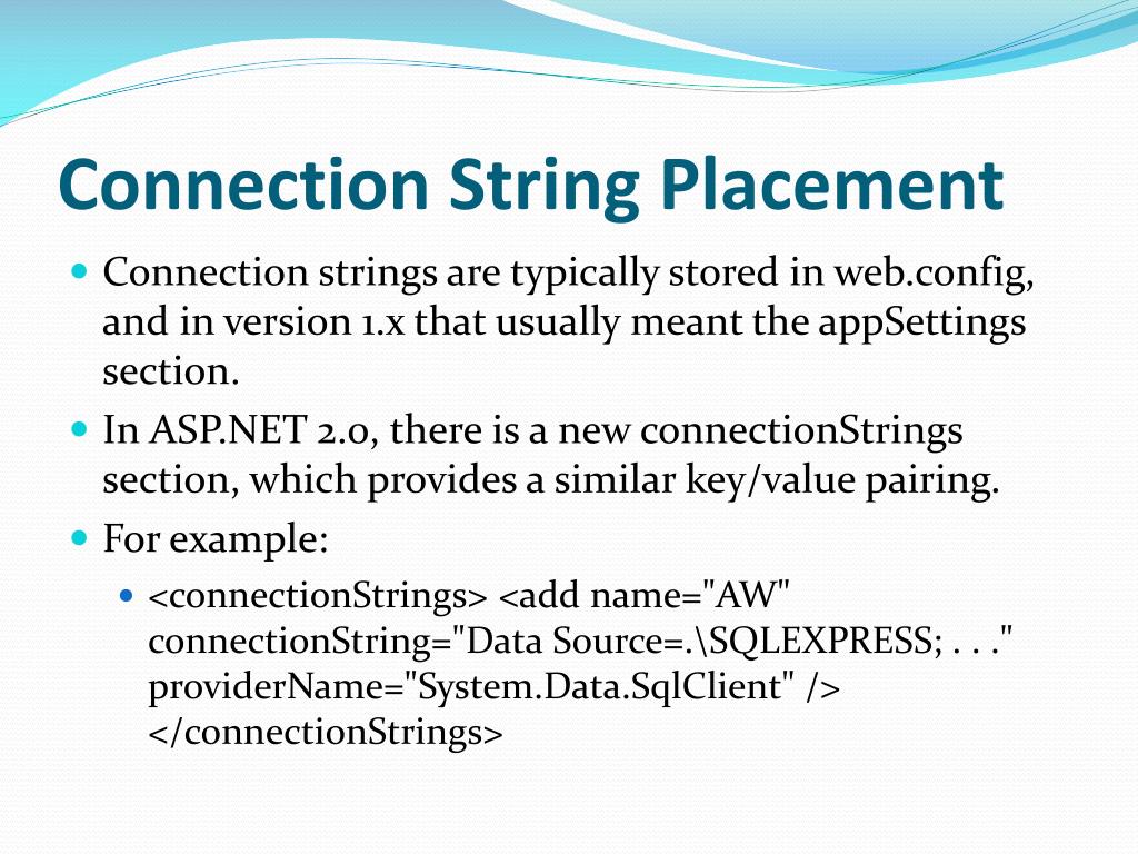 Connection String Placement • Connection strings are typically stored in web.config, and in version 1.x that usually meant the appSettings section. • In ASP.NET 2.0, there is a new connectionStrings section, which provides a similar key/value pairing. • For example: • <connectionStrings> <add name="AW" connectionString="Data Source=.\SQLEXPRESS; . . ." providerName="System.Data.SqlClient" /> </connectionStrings>