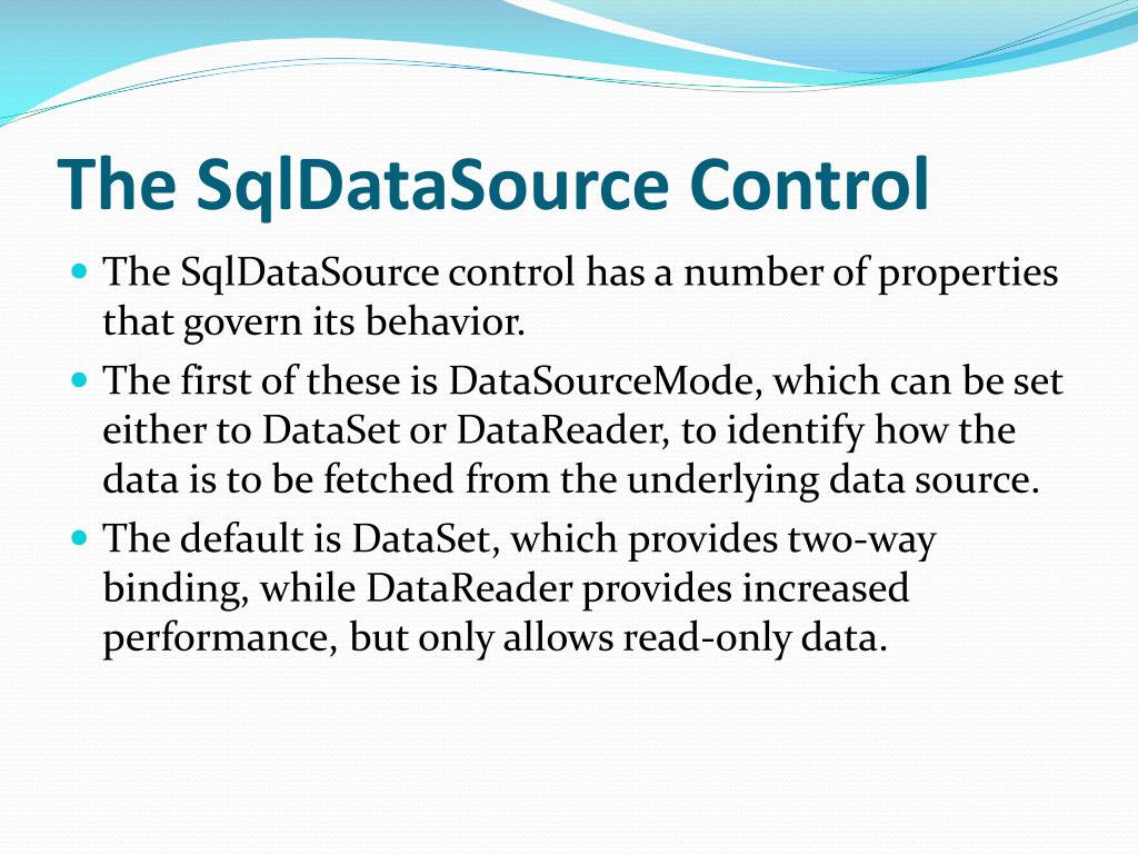 The SqlDataSource Control • The SqlDataSource control has a number of properties that govern its behavior. • The first of these is DataSourceMode, which can be set either to DataSet or DataReader, to identify how the data is to be fetched from the underlying data source. • The default is DataSet, which provides two-way binding, while DataReader provides increased performance, but only allows read-only data.