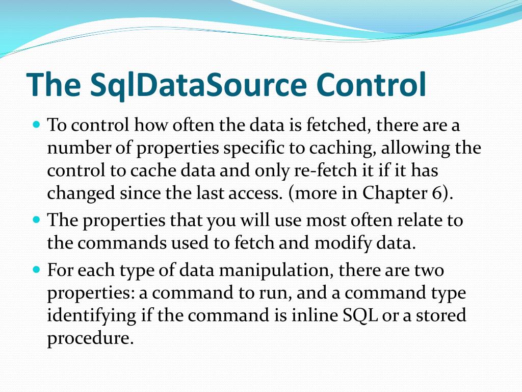 The SqlDataSource Control • To control how often the data is fetched, there are a number of properties specific to caching, allowing the control to cache data and only re-fetch it if it has changed since the last access. (more in Chapter 6). • The properties that you will use most often relate to the commands used to fetch and modify data. • For each type of data manipulation, there are two properties: a command to run, and a command type identifying if the command is inline SQL or a stored procedure.