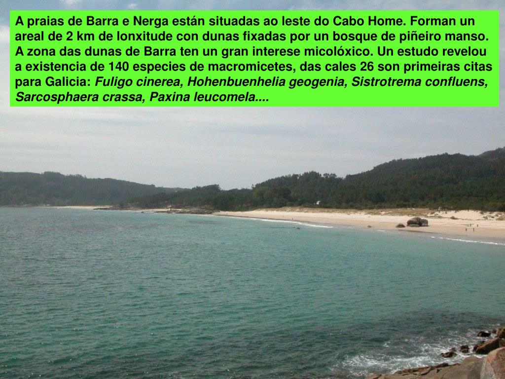 A praias de Barra e Nerga están situadas ao leste do Cabo Home. Forman un areal de 2 km de lonxitude con dunas fixadas por un bosque de piñeiro manso. A zona das dunas de Barra ten un gran interese micolóxico. Un estudo revelou a existencia de 140 especies de macromicetes, das cales 26 son primeiras citas para Galicia: Fuligo cinerea, Hohenbuenhelia geogenia, Sistrotrema confluens, Sarcosphaera crassa, Paxina leucomela....