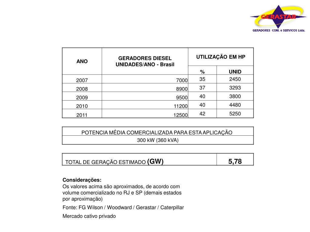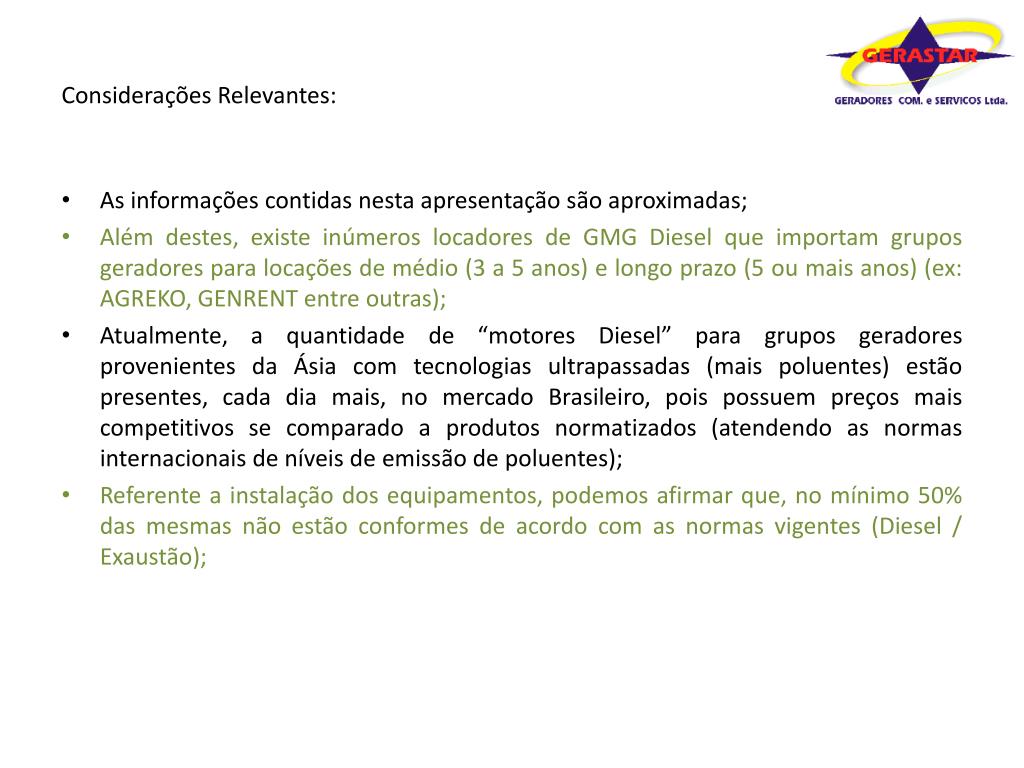 Considerações Relevantes: • As informações contidas nesta apresentação são aproximadas; • Além destes, existe inúmeros locadores de GMG Diesel que importam grupos geradores para locações de médio (3 a 5 anos) e longo prazo (5 ou mais anos) (ex: AGREKO, GENRENT entre outras); • Atualmente, a quantidade de “motores Diesel” para grupos geradores provenientes da Ásia com tecnologias ultrapassadas (mais poluentes) estão presentes, cada dia mais, no mercado Brasileiro, pois possuem preços mais competitivos se comparado a produtos normatizados (atendendo as normas internacionais de níveis de emissão de poluentes); • Referente a instalação dos equipamentos, podemos afirmar que, no mínimo 50% das mesmas não estão conformes de acordo com as normas vigentes (Diesel / Exaustão);