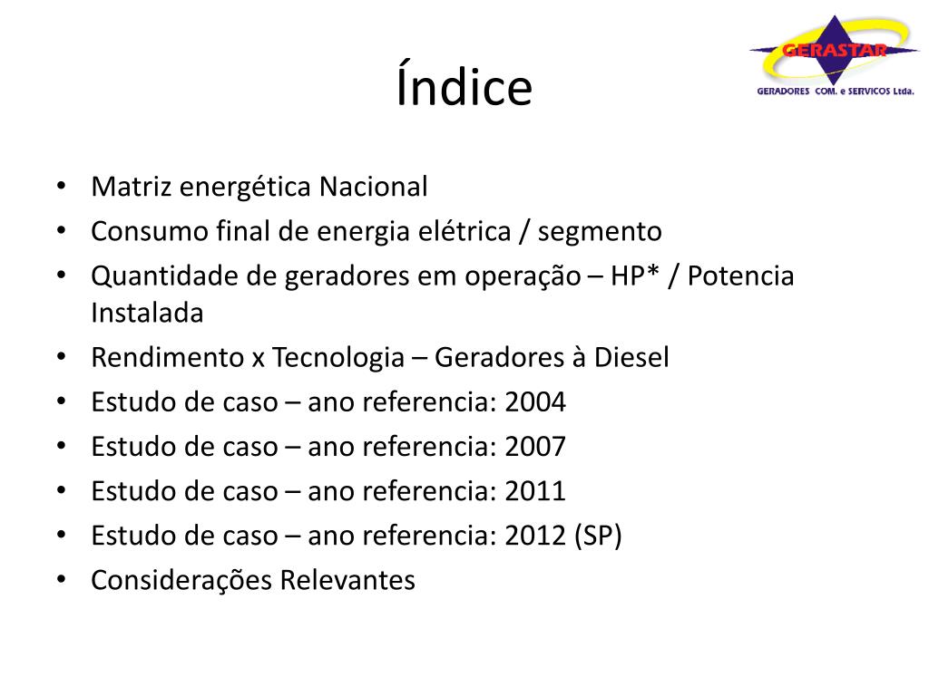 Índice • Matriz energética Nacional • Consumo final de energia elétrica / segmento • Quantidade de geradores em operação – HP* / Potencia Instalada • Rendimento x Tecnologia – Geradores à Diesel • Estudo de caso – ano referencia: 2004 • Estudo de caso – ano referencia: 2007 • Estudo de caso – ano referencia: 2011 • Estudo de caso – ano referencia: 2012 (SP) • Considerações Relevantes