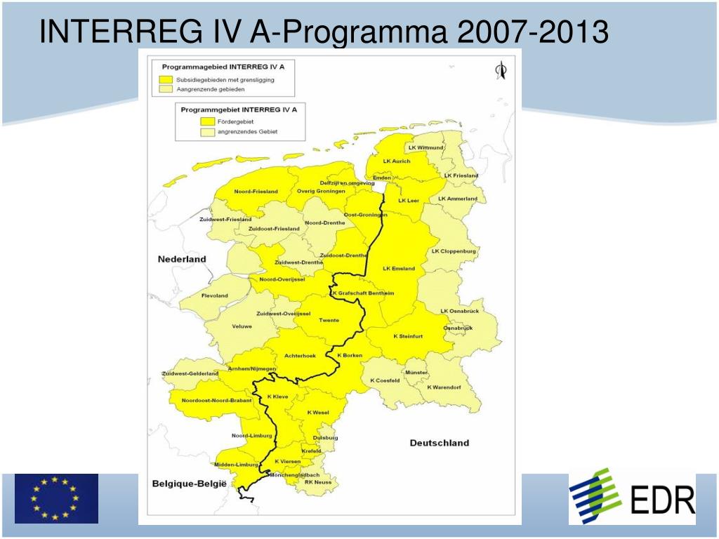 INTERREG IV A-Programma 2007-2013 • Speerpunten: • Economie, technologie en innovatie • 2. Versterkingduurzame regionale ontwikkeling • Integratie en samenleving • Totale investeringsvolume: 295 mln. Euro • EU-aandeel: 138 mln. Euro / EU-middelenvoor EDR: 38 mln. euro
