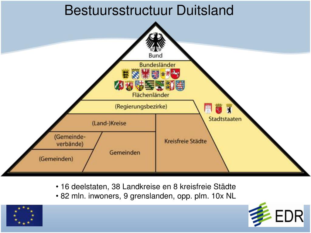 Bestuursstructuur Duitsland • 16 deelstaten, 38 Landkreise en 8 kreisfreie Städte • 82 mln. inwoners, 9 grenslanden, opp. plm. 10x NL