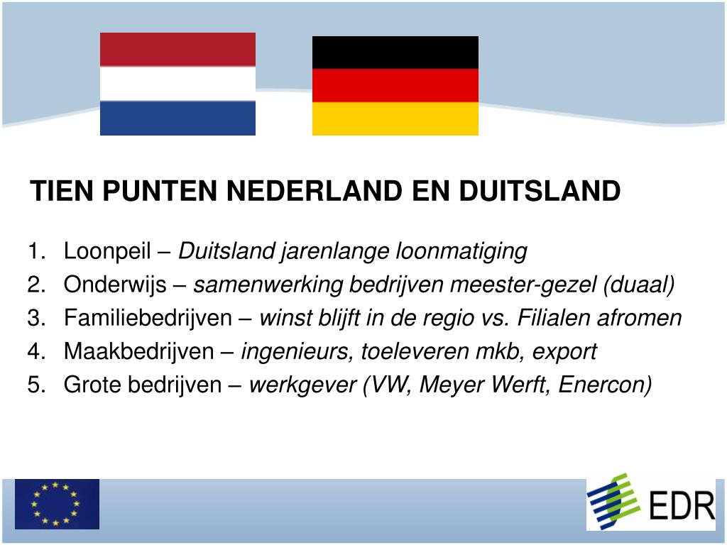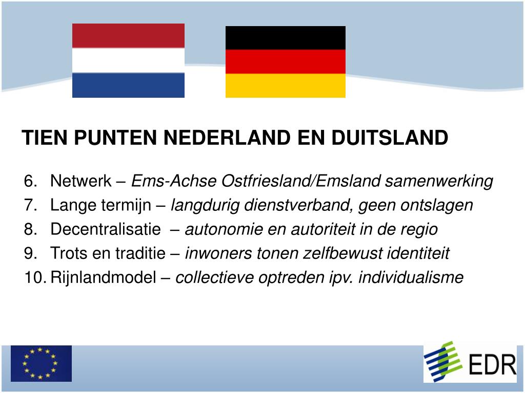 TIEN PUNTEN NEDERLAND EN DUITSLAND 6. Netwerk – Ems-Achse Ostfriesland/Emsland samenwerking 7. Lange termijn – langdurig dienstverband, geen ontslagen 8. Decentralisatie – autonomie en autoriteit in de regio 9. Trots en traditie – inwoners tonen zelfbewust identiteit 10. Rijnlandmodel – collectieve optreden ipv. individualisme