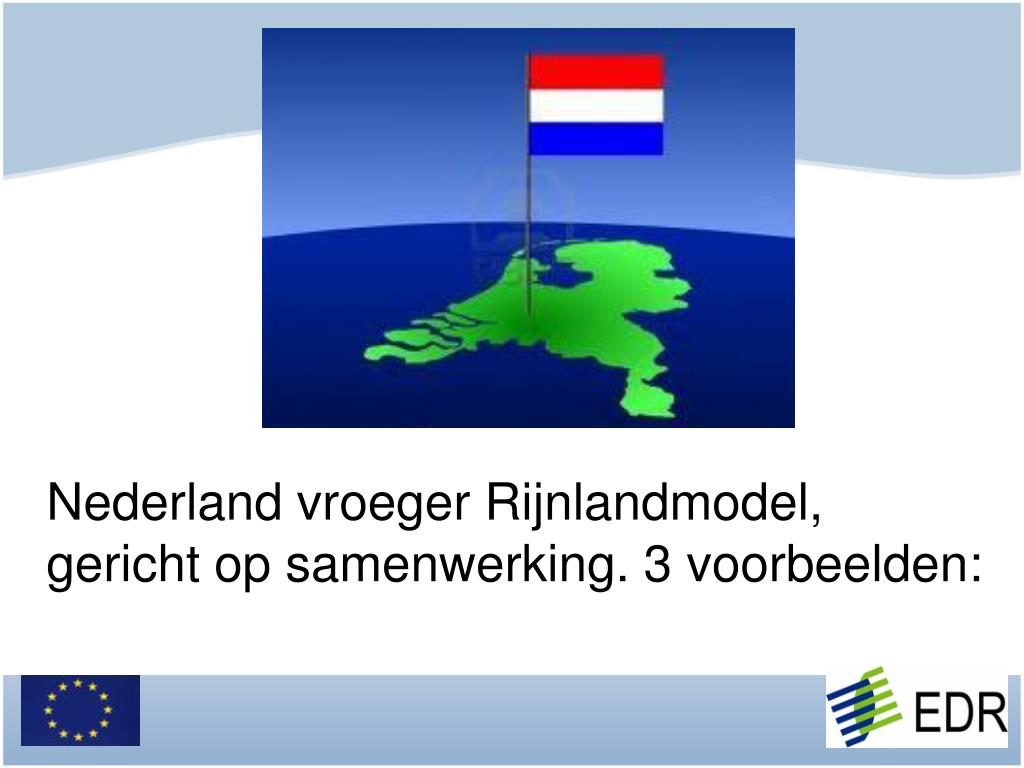 Nederland vroeger Rijnlandmodel, gericht op samenwerking. 3 voorbeelden: