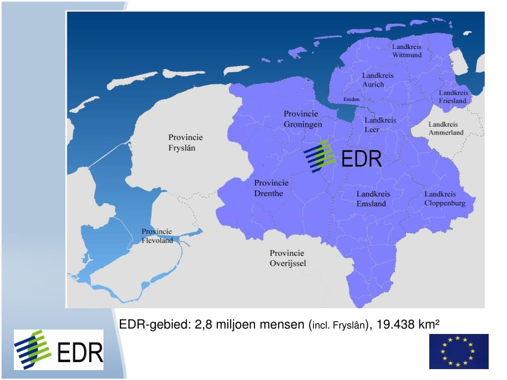 Eems Dollard Regio (EDR) Op 28 februari 1977 opgericht en vanaf 1997 openbaarlichaam. 100 leden (gemeenten, Landkreise, KvK, IHK). FunctiesGrensregio 2.0: • Kenniscentrum: informatie Noord-Nederland en Noordwest-Duitsland • Netwerkcentrum: contacten en initiatievenstimuleren en ontwikkelen • Coördinatiecentrum: organiseren en uitvoerentaken in grensregio