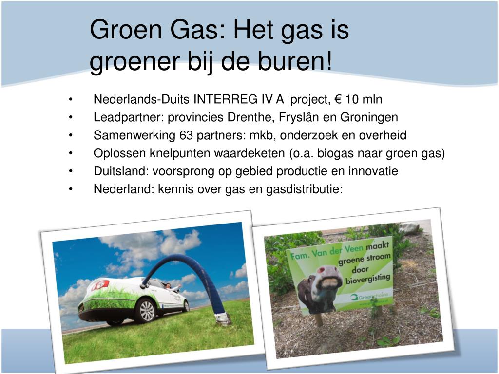 Groen Gas: Het gas is groener bij de buren! • Nederlands-Duits INTERREG IV A project, € 10 mln • Leadpartner: provincies Drenthe, Fryslân en Groningen • Samenwerking 63 partners: mkb, onderzoek en overheid • Oplossen knelpunten waardeketen (o.a. biogas naar groen gas) • Duitsland: voorsprong op gebied productie en innovatie • Nederland: kennis over gas en gasdistributie: