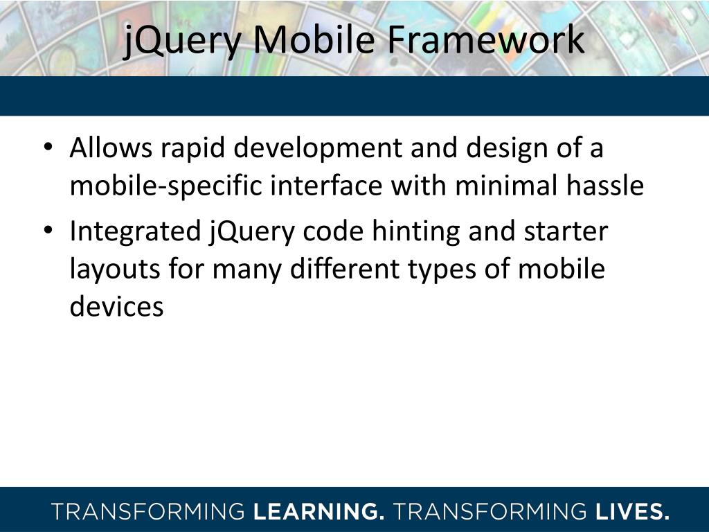 jQuery Mobile Framework • Allows rapid development and design of a mobile-specific interface with minimal hassle • Integrated jQuery code hinting and starter layouts for many different types of mobile devices