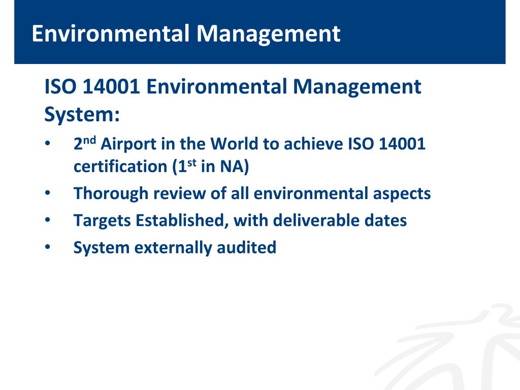 Environmental Management • ISO 14001 Environmental Management System: • 2ndAirport in the World to achieve ISO 14001 certification (1st in NA) • Thorough review of all environmental aspects • Targets Established, with deliverable dates • System externally audited