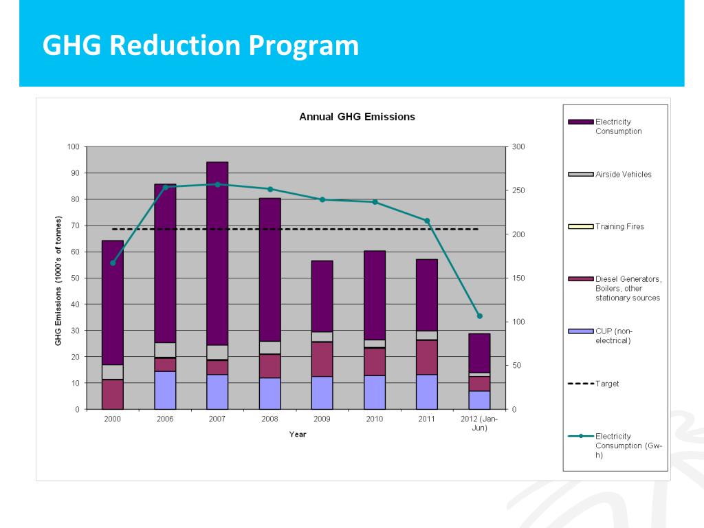 Looking Back: Greenhouse Gas Policy • GHG emissions identified as a Corporate Risk • Commitments: • Reduce GTAA’s GHG emissions by 20% below 2006 baseline by 2020 • Annual funding for GHG-reducing programs and projects • Take GHG emissions into account in future projects • Annual internal reporting on GHG-reducing programs and projects