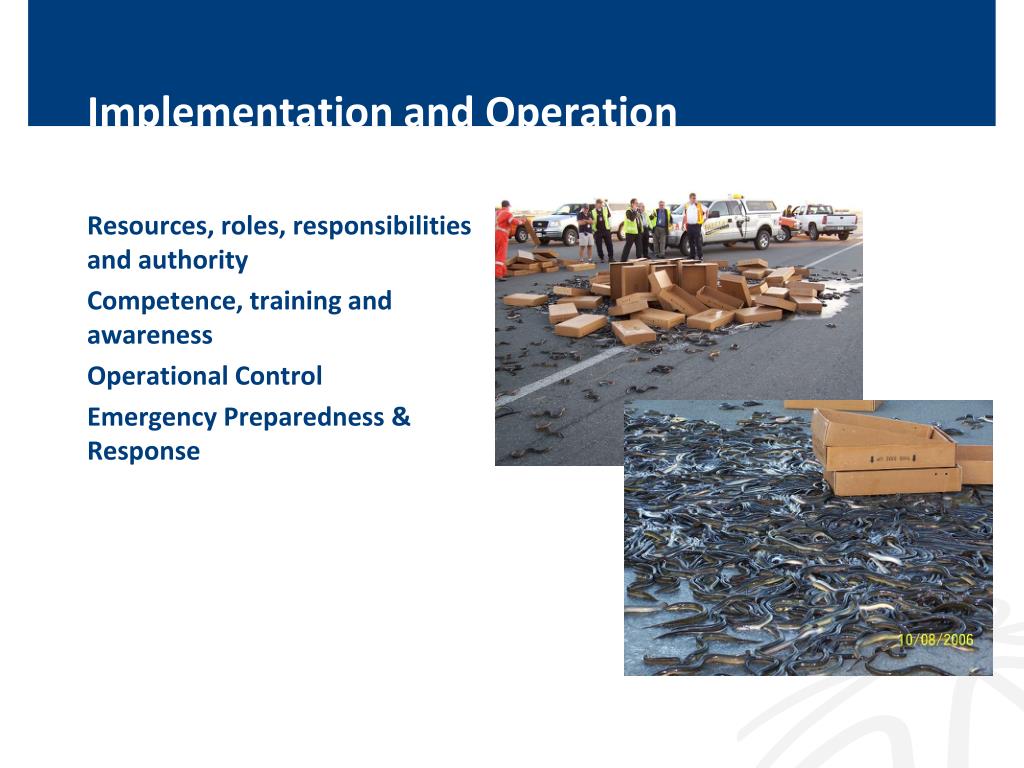 Implementation and Operation • Resources, roles, responsibilities and authority • Competence, training and awareness • Operational Control • Emergency Preparedness & Response