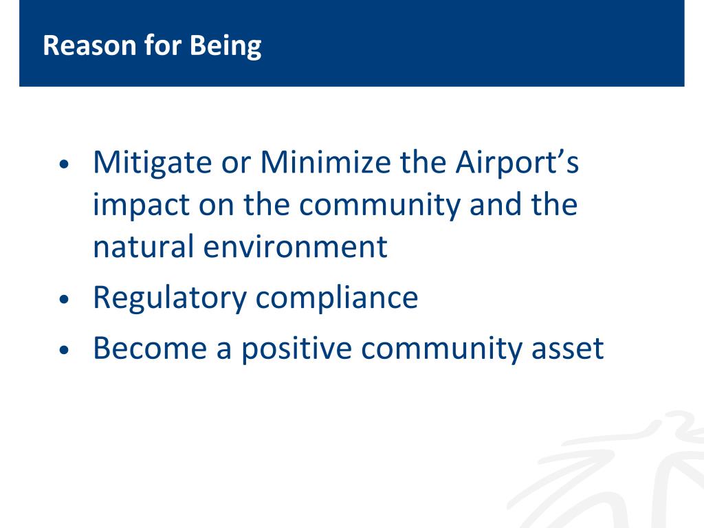 Reason for Being • Mitigate or Minimize the Airport’s impact on the community and the natural environment • Regulatory compliance • Become a positive community asset