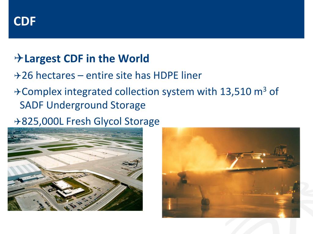 CDF • Largest CDF in the World • 26 hectares – entire site has HDPE liner • Complex integrated collection system with 13,510 m3 of SADF Underground Storage • 825,000L Fresh Glycol Storage