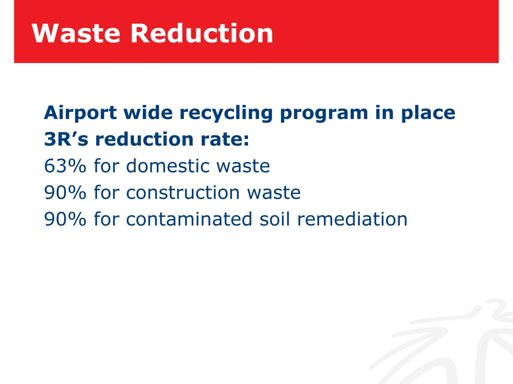 Waste Reduction • Airport wide recycling program in place • 3R’s reduction rate: • 63% for domestic waste • 90% for construction waste • 90% for contaminated soil remediation