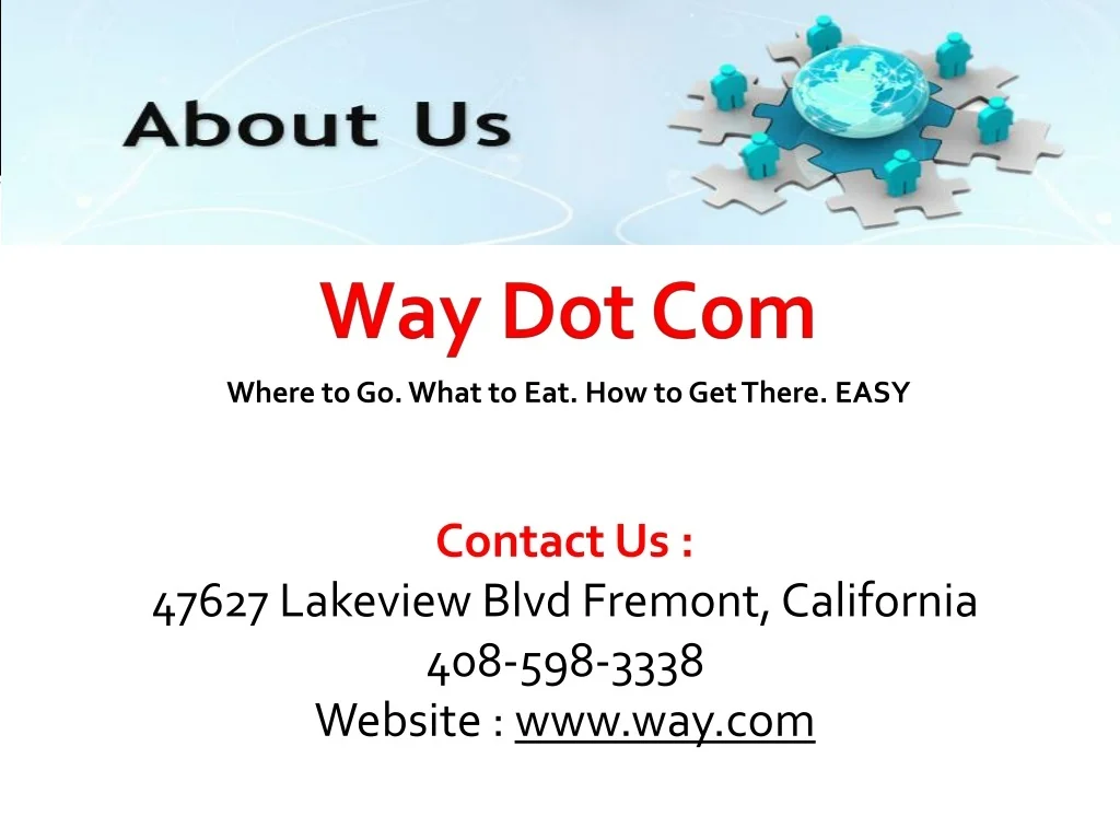 Way Dot Com Contact Us : 47627 Lakeview Blvd Fremont, California 408-598-3338 Website : www.way.com Where to Go. What to Eat. How to Get There. EASY