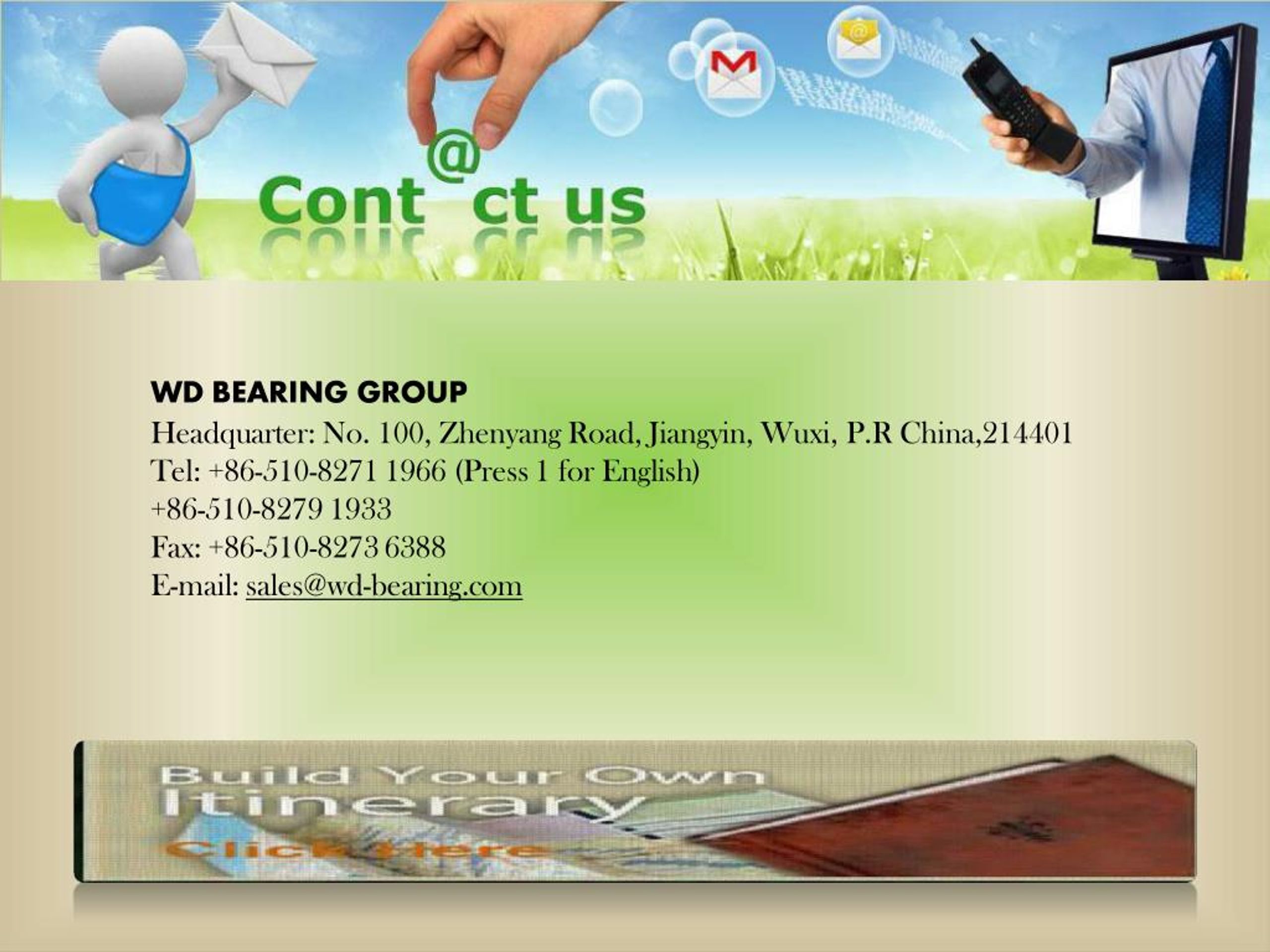 WDBEARINGGROUP Headquarter:No.100,ZhenyangRoad,Jiangyin,Wuxi,P.RChina,214401Tel:+86-510-82711966(Press1forEnglish) +86-510-82791933 Fax:+86-510-82736388 E-mail:sales@wd-bearing.com