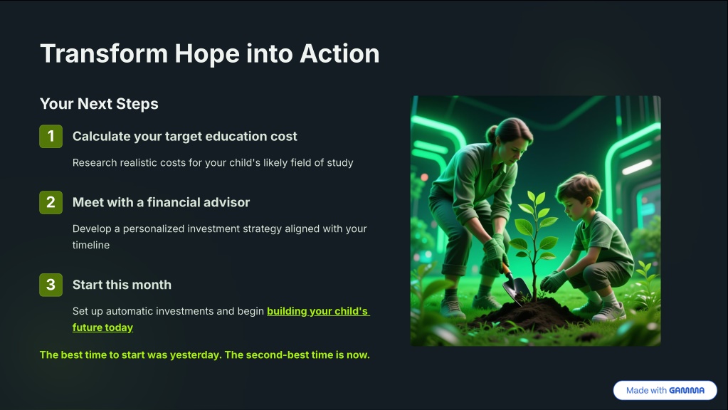 10. Transform Hope into Action Your Next Steps 1 Calculate your target education cost Research realistic costs for your child's likely field of study 2 Meet with a financial advisor Develop a personalized investment strategy aligned with your timeline 3 Start this month Set up automatic investments and begin building your child's future today The best time to start was yesterday. The second-best time is now.